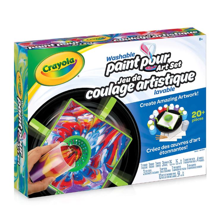 Pour out a colourful masterpiece with Crayola Washable Paint Pour Art Set! Paint pouring is the fun, easy way for even novice painters to achieve beautiful works of art. And there’s no cause to worry either with the included less-mess paint tray. Even the occasional “oops” is no problem with Crayola Washable Paint. It’s a truly magical and fun art activity for kids and adults! Once you've decorated the 3 included canvases, refill your collection to keep the fun going! This paint set works with any standard painting canvas.