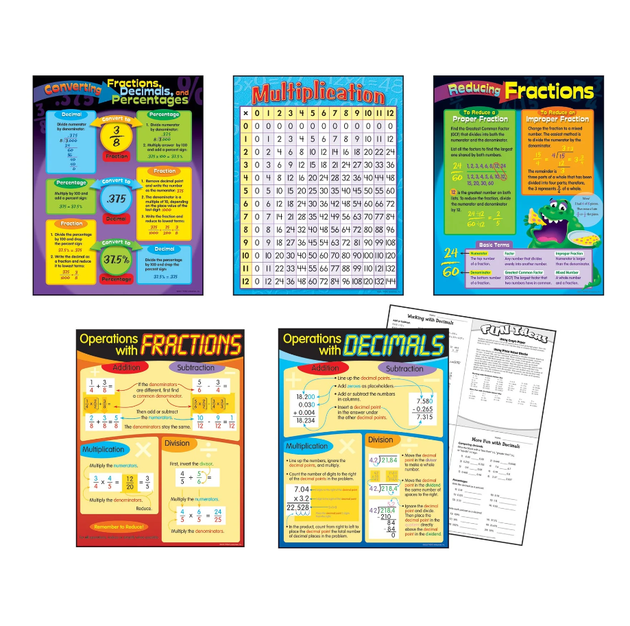- 5 charts: Converting Fractions, Decimals, and Percentages, Reducing Fractions, Multiplication, Operations with Fractions, and Operations with Decimals
