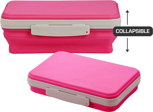 Adjustable storage case expands to 3" high to meet your needs and hold your belongings securely inside. Made of durable and ductile rubber material to stretch and expand. Latches shut with colorful contrasting closure to ensure nothing gets lost. 6" x 9". Pink and Grey.