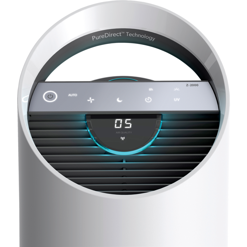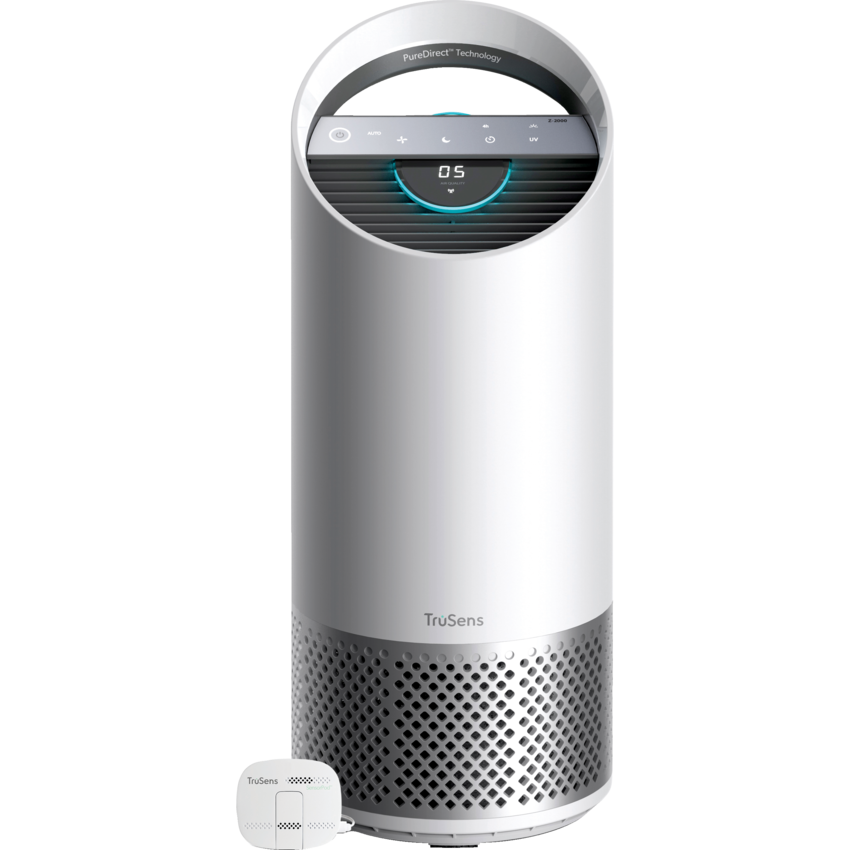 Experience the difference of TruSens® Air Purifiers. The 360-degree DuPont™ HEPA filter capture pollutants, VOC gases and neutralizes odors by automatically adapting to changing air quality conditions in a room. Place the remote SensorPod away from the ai. A colour-coded illuminated ring and numerical value communicates good, moderate or poor air quality. Covers 375 sq. ft.. Carbon, HEPA and UV filters. Auto and dimmer mode. Timer settings of 2, 4, 8, or 12 hours. Filter change indicator type. 32-66 dB noise level. 2-year warranty. White.