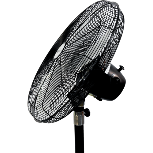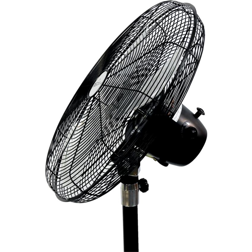 Medium sized commercial pedestal fan with powerful airflow. High fan speed delivers 5800 CFM air volume. Powerful and portable with 3 speed selections. 55° oscillating, 45° tilt adjustable fan head and 42" - 56" adjustable height. 20" diameter. Black.