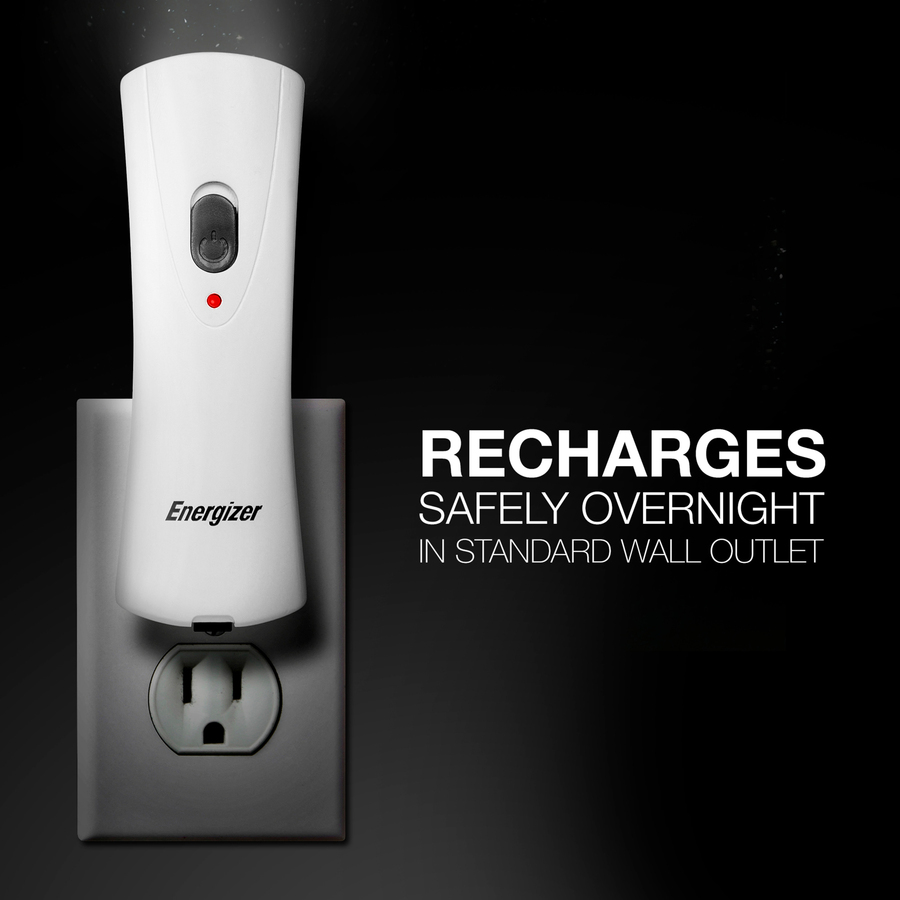 Stay prepared with this rechargeable handheld compact flashlight. Built-in NiMH battery recharges overnight when plugged into a wall outlet, delivering a runtime of up to 3.5 hours. Retractable sliding plug system transforms the wall unit into a handheld emergency flashlight.