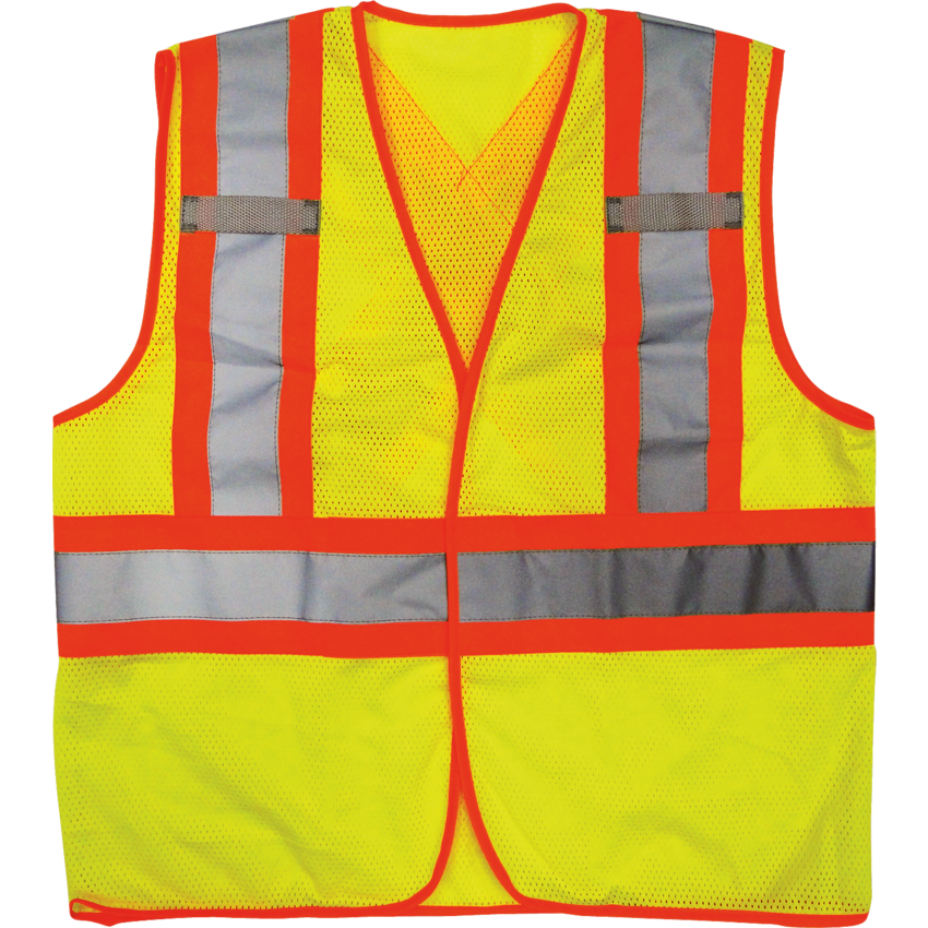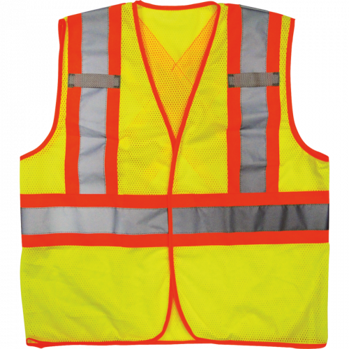 Lightweight and comfortable, fluorescent sport mesh knit fabric. 4" orange/silver reflective stripes offer maximum nighttime visibility. CSA compliant. 360° horizontal stripe around torso, two vertical stripes on front and 'X' on back. Front hook and loop closure permits optimal fitting. Medium. Yellow.