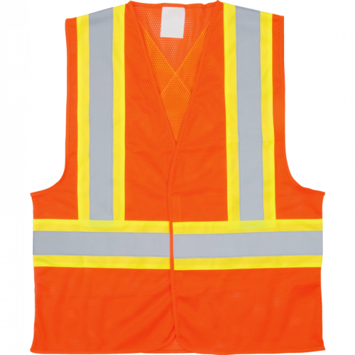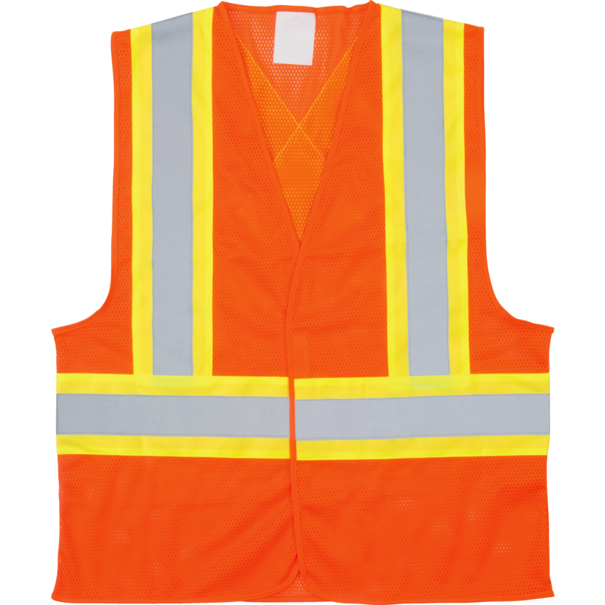 Lightweight and comfortable, fluorescent sport mesh knit fabric. 4" orange/silver reflective stripes offer maximum nighttime visibility. CSA compliant. 360° horizontal stripe around torso, two vertical stripes on front and 'X' on back. Front hook and loop closure permits optimal fitting. 2X-Large. Orange.