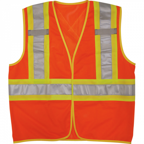 Lightweight and comfortable, fluorescent sport mesh knit fabric. 4" orange/silver reflective stripes offer maximum nighttime visibility. CSA compliant. 360° horizontal stripe around torso, two vertical stripes on front and 'X' on back. Front hook and loop closure permits optimal fitting. Medium. Orange.