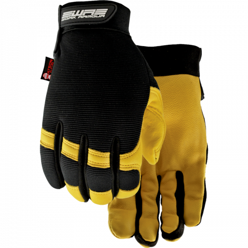 Full-grain goatskin leather palm is hard wearing and durable, providing great dexterity. Spandex back provides form-fitting memory. Hooded fingertips and reinforced thumb for additional padding. Snug-fitting elastic wrist with Velcro® closure. X-Large.