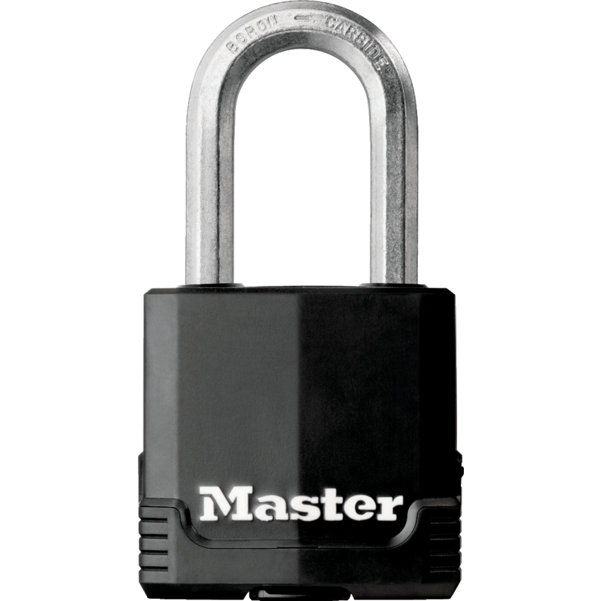 Dual ball bearing locking for maximum pry resistance. 4-pin cylinder for increased pick resistance. Rust-Oleum® certified rustproof. Dual-Armor™ construction protects against tough conditions. Tough-Cut™ octagonal boron-carbide shackle is harder than hardened steel and nearly impossible to cut with bolt cutters. 1-1/2" (38 mm) shackle clearance. Black.