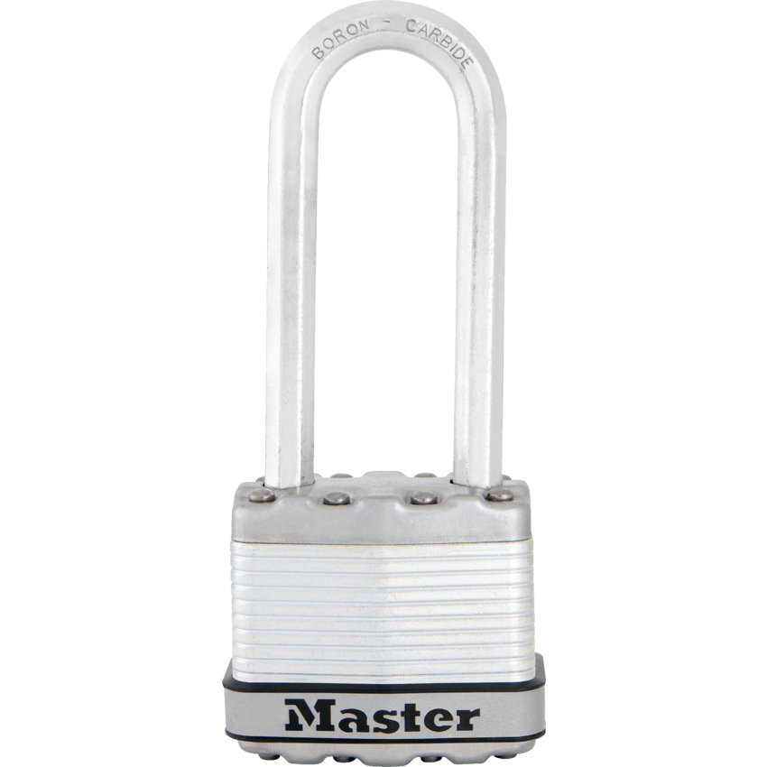 Dual ball bearing locking for maximum pry resistance. 4-pin cylinder for increased pick resistance. Reinforced body bumper for scratch resistance. Dual-Armor™ construction protects in tough conditions. Tough-Cut™ octagonal boron-carbide shackle is harder than hardened steel and nearly impossible to cut with bolt cutters. Stainless steel top/bottom caps and rivets. Zinc body. 2-1/2" (63.5 mm) shackle clearance. Silver.