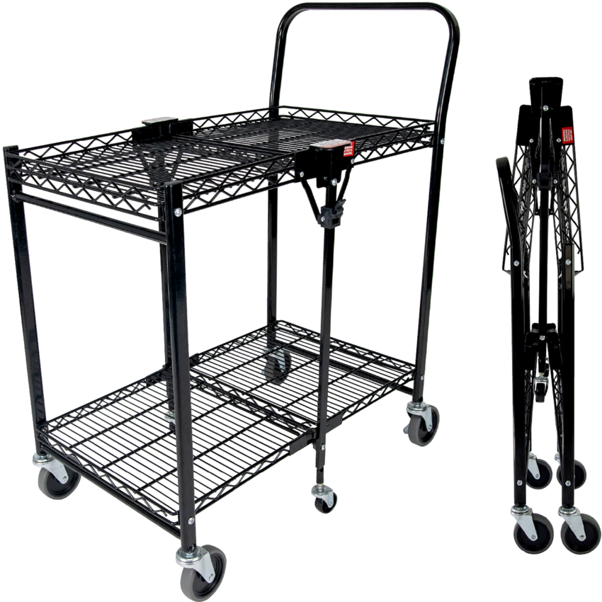 Patented folding design allows for simple and convenient storage when not in use. Dual shelves provide extra storage space. Medical style no-mar swivel wheels for quiet operation and easy maneuverablilty. Metal. 400 lb. capacity. 31"W x 19-1/2"D x 39”H. Black.