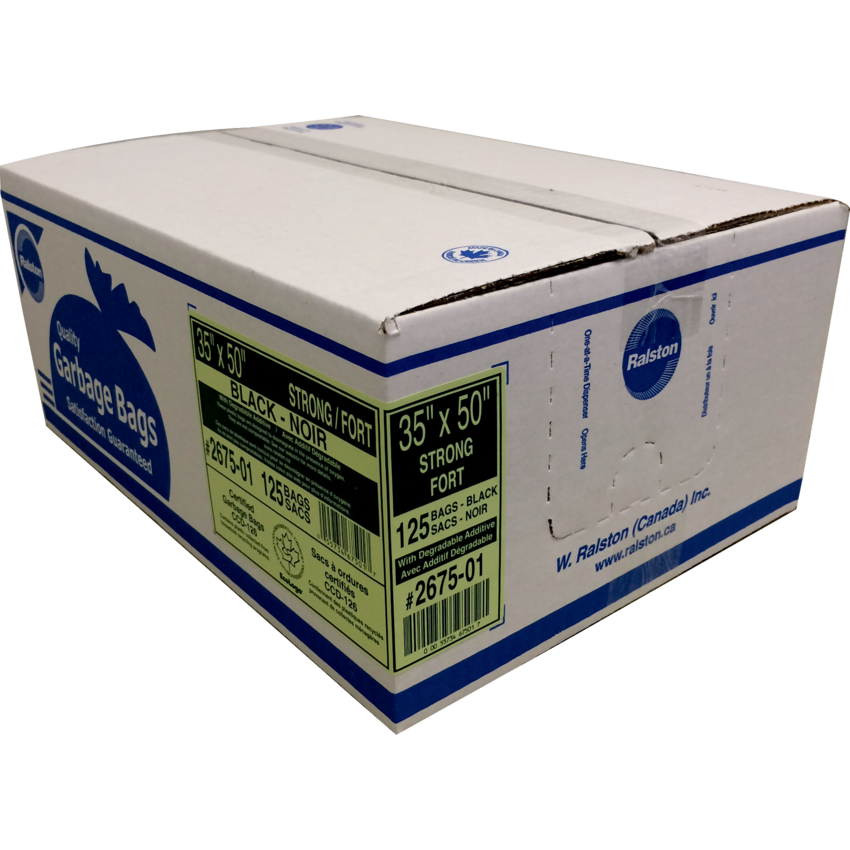 Economical and a lighter gauge. Plastics from household blue box programs and post industrial-use materials are collected and recycled as part of the manufacturing of these bags. Contains a minimum of 10% post-consumer recycled material. Strong. 35" x 50". Black. 125/ctn.