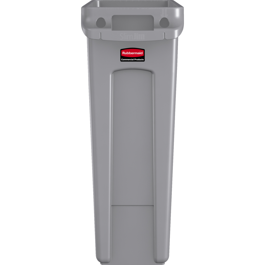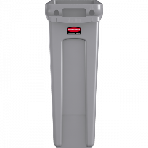 Efficient size and shape designed to fit tight spaces. Durable all-plastic construction is easy to clean. Molded-in handles and base grips make lifting and emptying easier. Integrated venting channels takes the strain out of liner removal. 20"W x 11"D x 30"H. 87 L. Grey.