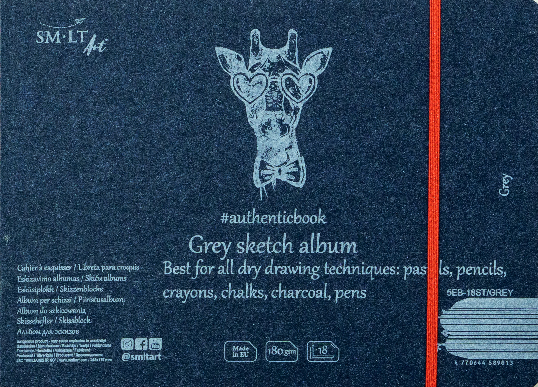 With grey paper. With cotton. Cotton fibers create roughness to the surface and pure cellulose fibers add volume and strenght. Best for all dry drawing techniques. Inside paper is Acid-free. With natural colored cardboard cover and divider. The album is stitched, with panoramic drawing possibility.