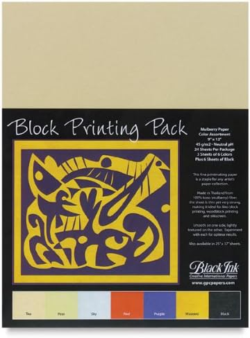 This Black Ink brand block printing pack includes 25 sheets of bleached 9″ x 12″ mulberry paper. Not only great for linoleum and wood block printing, but can also be used for silk screening, sumi painting, light watermedia, bookbinding and digital photo reproductions.