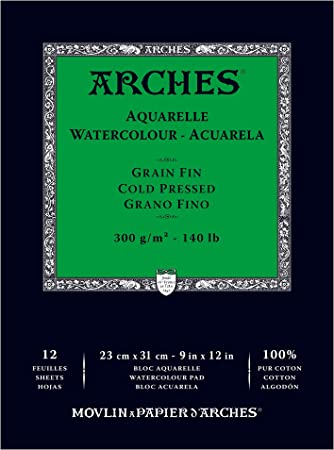ARCHES® Natural White Watercolour Pad. The only 100% cotton paper in the world to gelatin size its watercolour paper “to the core”. This preserves the lustre and transparency of the colours whilst preventing paints from penetrating the paper. It allows superposing of washes and gives it added strength to resist erasing and scratching without tearing or linting and can absorb a large amount of water with limited deformation.