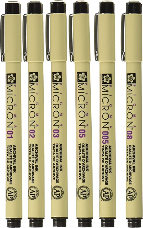 Invented by Sakura over 30 years ago and continues to be the most reliable permanent ink on the market today. Will not smear or feather when dry. Waterproof, archival quality ink is fade resistant and does not bleed through papers. Set of 6 pens including: 005, 01, 02, 03, 05, 08