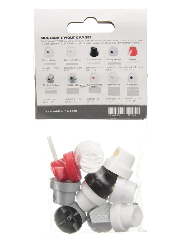 The Montana TRYOUT Cap Set is an all-round cap sets that enables users to try a variety of caps and their characteristics. Consisting of ten different caps, the assortment has caps that offer varying spray outputs from skinny, fat, rectangular and round. Apart from the Level Cap system which is optimised for use on Montana GOLD, the TRYOUT CAP set can enable graffiti artists, street artists, urban artists, DIYers, Crafters and practical object painters all to experiment with different potential spray trajectories that all fit on female valve cans.