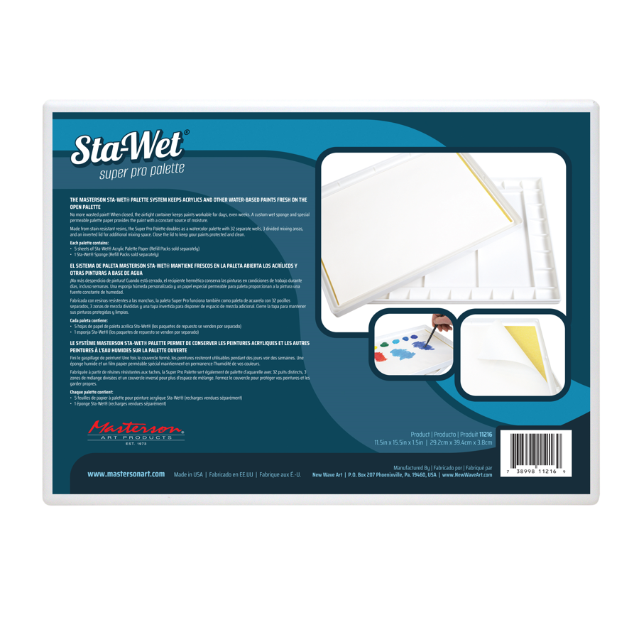 - For use with Acrylics, use the Masterson Sta-Wet Palette Paper and Sponge (five sheets and one sponge included). The Sta-Wet palette system was developed by Masterson over 25 years ago and is unmatched in its level of functionality. Masterson’s Sta-Wet system keeps acrylics and other water-based paints moist on the open palette for hours. Once the lid is closed, the paints will stay in workable condition for days, even weeks. A wet sponge and special permeable palette paper provide the paint with a constant source of moisture. Your paints will not dry out.