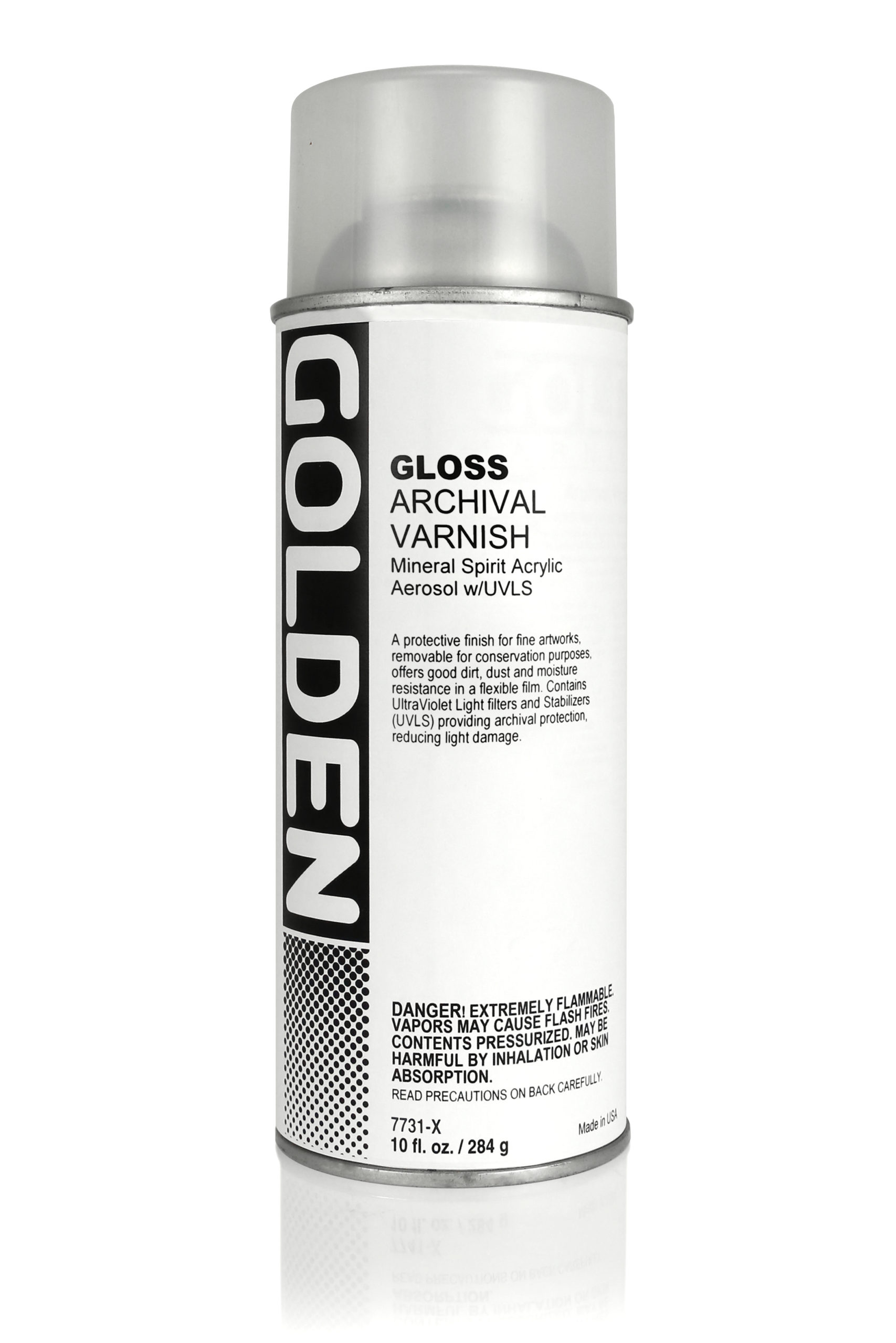 GOLDEN Gloss Archival Varnish. Mineral Spirit Acrylic Aerosol w/UVLS. A protective finish for fine artworks, removable for conservation purposes, offers good dirt, dust and moisture resistance in a flexible film. Contains UltraViolet Light filters and Stabilizers (UVLS) providing archival protection, reducing light damage.