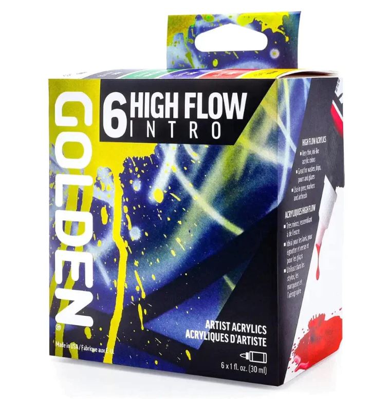Experience the ink-like consistency and incredible versatility of High Flow Artist Acrylics with this balanced selection of colours. Includes: Benzimidazolone Yellow Medium, Naphthol Red Light, Ultramarine Blue, Permanent Green Light, Carbon Black and Titanium White.
