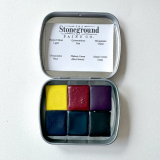 Our Cool Botanical Palette contains six half pans of our handmade watercolour paint in a hinged metal tin. Measuring approximately 2 1/2” x 2”, this compact size is ideal for travel and plein air painting.