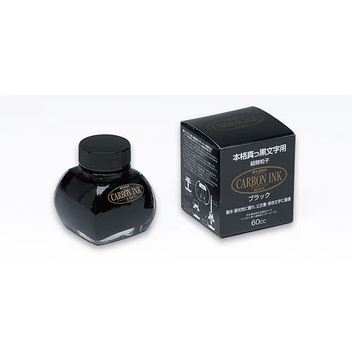 A 60ml glass bottle of Platinum Carbon Black fountain pen ink. Platinum Carbon Black fountain pen ink is a rich shade of black. Comes with integrated ink reservoir. A pigment-based, waterproof carbon ink that is highly sought after by artists for drawing and lines or washes.