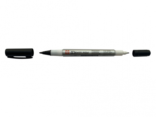 IDENTI-PEN® is a multi-purpose pen that marks on almost any surface. The dual point IDenti-pen is two, permanent sharp-pointed marking pens in one: a tough fibre nib tip, fine-point bullet nib on one end and an extra fine plastic tip for details on the other. Use this pen on paper products and non-porous surfaces such as metal, glass, tools, sporting goods, test tubes, photographs, plastics, vinyl, wood products, and labels.