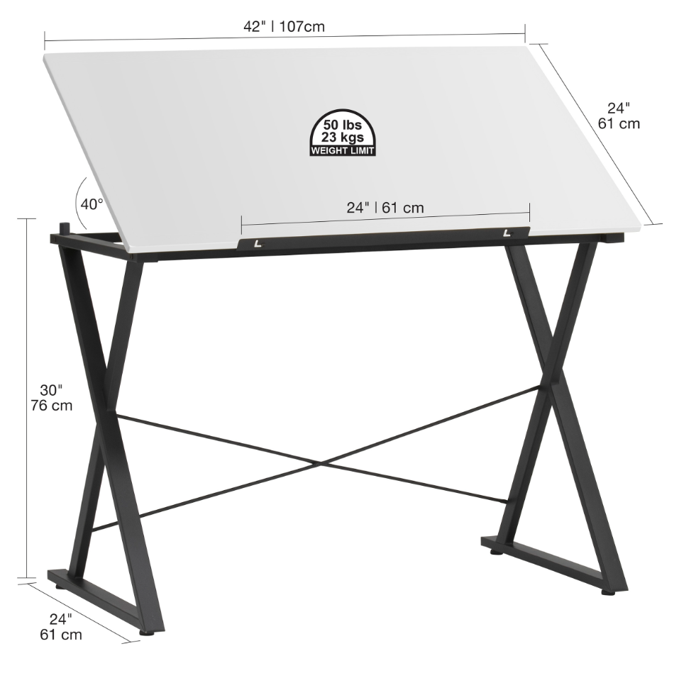 The Axiom Drawing Table by Studio Designs is a simple, modern design and offers an affordable solution for those new artists looking for a simple tilting top table. Like other drafting tables, the top adjusts from flat to a 40-degree angle. The 24” Pencil Ledge keeps your pencils and markers on the table top while tilted. The large 42” wide x 24” deep top offers plenty of space for your projects. This simple table can easily be upgraded by adding an art supply storage tray or a clamp lamp also available from Studio Designs. Keep it simple or customize it, either way, this table provides a stylish option for your drawing needs.