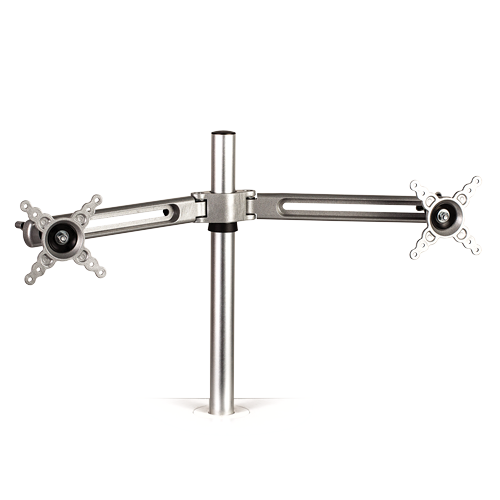 Lotus Dual Monitor Arm Kit is compatible with the Fellowes Lotus Sit Stand Workstation that raises monitors to an optimal viewing height to prevent neck strain and free up valuable work space. Monitor arm is easy to mount via grommet hole, allowing quick setup. Height adjusts up to 16" above the top surface of the Lotus Sit Stand Workstation with a reach of 12-1/2". Each arm holds a monitor up to 27" and 13 lb. Metal dual-monitor arm meets VESA mounting standards.