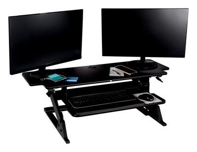 Provide maximum adjustability to achieve your most comfortable standing work position. Side-mounted levers control gas-assist height change. Large work surface accommodates two 27" monitors. Contains a minimum of 45% post-consumer recycled material. Separate keyboard surface has an adjustable tilt range from -10°/+10°. 3M™ Gel Wrist Rest and Precis™ Mouse Pad for added comfort and productivity. Height range from 6-1/5" to 20" above desk surface. 45 lb capacity. 42"W x 23-1/5"D. Black.
