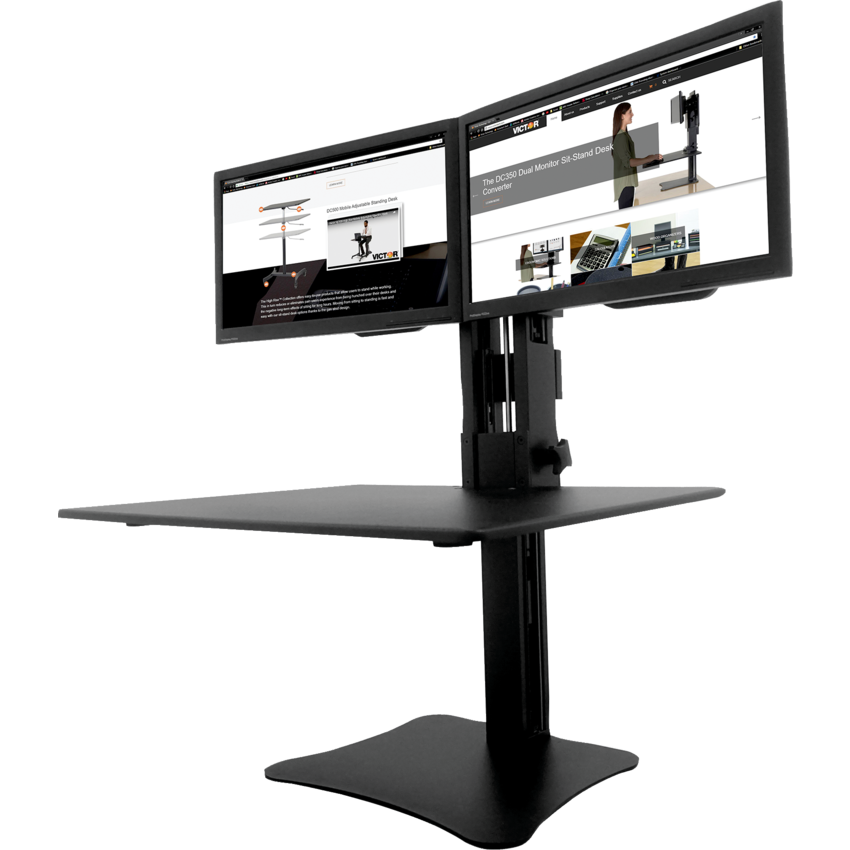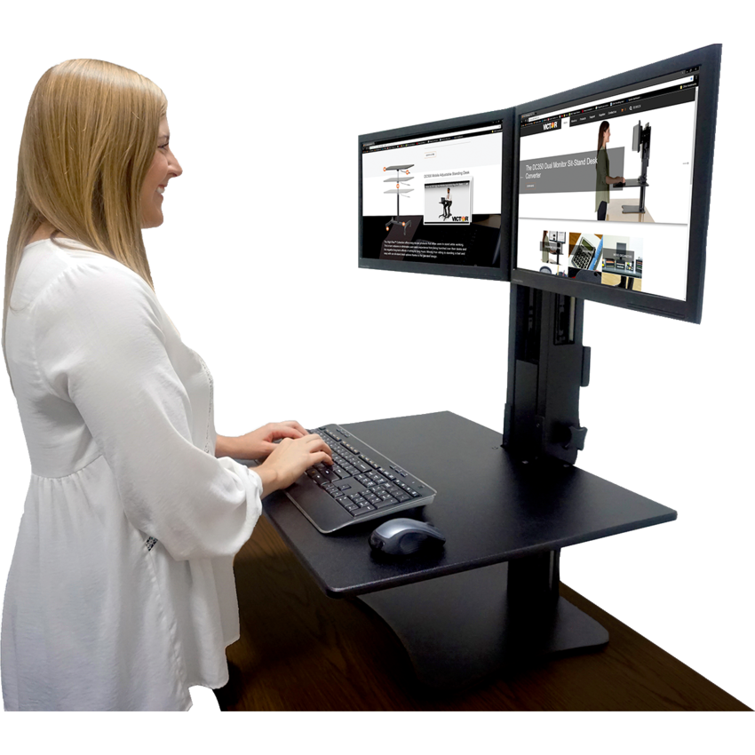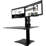 Transform any sit down desk into a sit or stand desk. Gas strut design allows easy custom height adjustment with the twist of a knob. Work surface lowers to become flush with desktop. Heavy steel base prevents tipping. Rounded rear work surface corners create more usable space, while still fitting into corner cubicles. Dual Monitor. 3 Year Limited Warranty. Black. 28"W x 23"D x 15-1/2"H.
