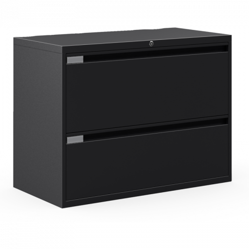 These solidly constructed, stylish fixed front lateral filing cabinets have a variety of great features. Full width, looped, full pull handles and levelling glides ensure drawers open easily. Cam locks and side-to-side bars are standard. Available in a va. 2-Drawer. 36"W x 18"D x 27-1/8”H. Black. Lifetime warranty.
