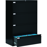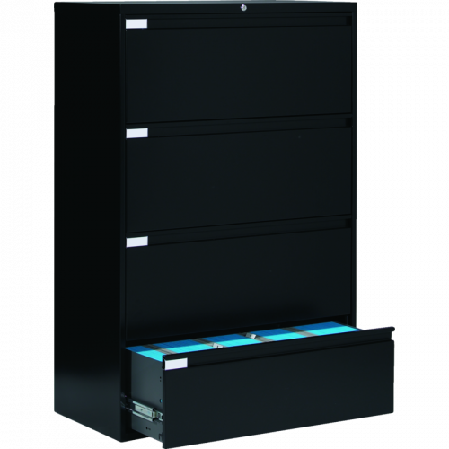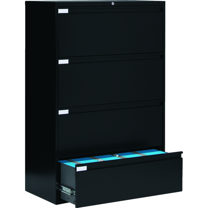 All fixed front lateral file drawers (“B” & “L”) hold letter, legal and A4 metric file sizes with side-to-side hanging file bars provided.
