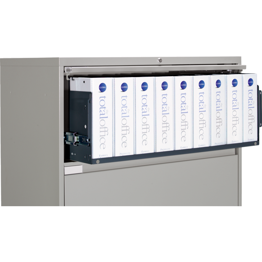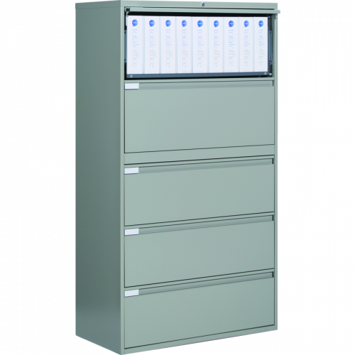 These solidly constructed, stylish fixed front lateral filing cabinets have a variety of great features. Full width, looped, full pull handles and levelling glides ensure drawers open easily. Cam locks and side-to-side bars are standard. Available in a va. 5-Drawer. Top drawer has receding door and roll-out shelf. 36"W x 18"D x 65-1/4”H. Grey. Lifetime warranty.