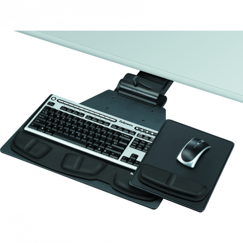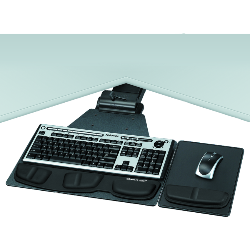 Height and tilt indicators let you customize your tray settings. Designed and manufactured for Fellowes® by Humanscale®. Comfort-Lift™ system lets you slide mouse platform left or right over keyboard numeric pad and offers 2 custom height positions. Mouse platform tilts forward or backward and adjusts up or down to height of keyboard. Mouse platform mounts on left or right . 28-3/16"W x 21-1/4"D x 5-3/4"H. Black.