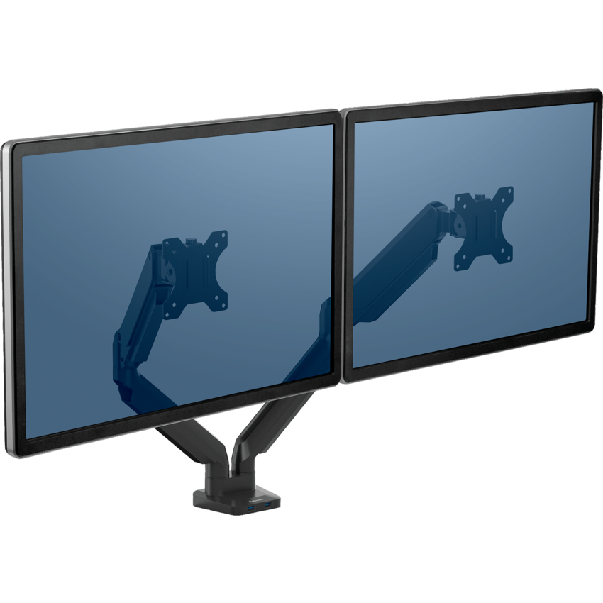 Increase valuable desk space and easily adjust your monitor to reduce eye, neck and shoulder strain. Mounts via clamp or grommet. Dual Arm. Two USB ports located at the base of the product. Meets VESA mounting standards. Height range from 5-1/3" to 16-1/3". Tilts -45° to +45°. 2-1/2" to 19-1/2" depth adjustment. Rotates 360°. For monitors up to 17.6 lbs (32") on each arm. Black.