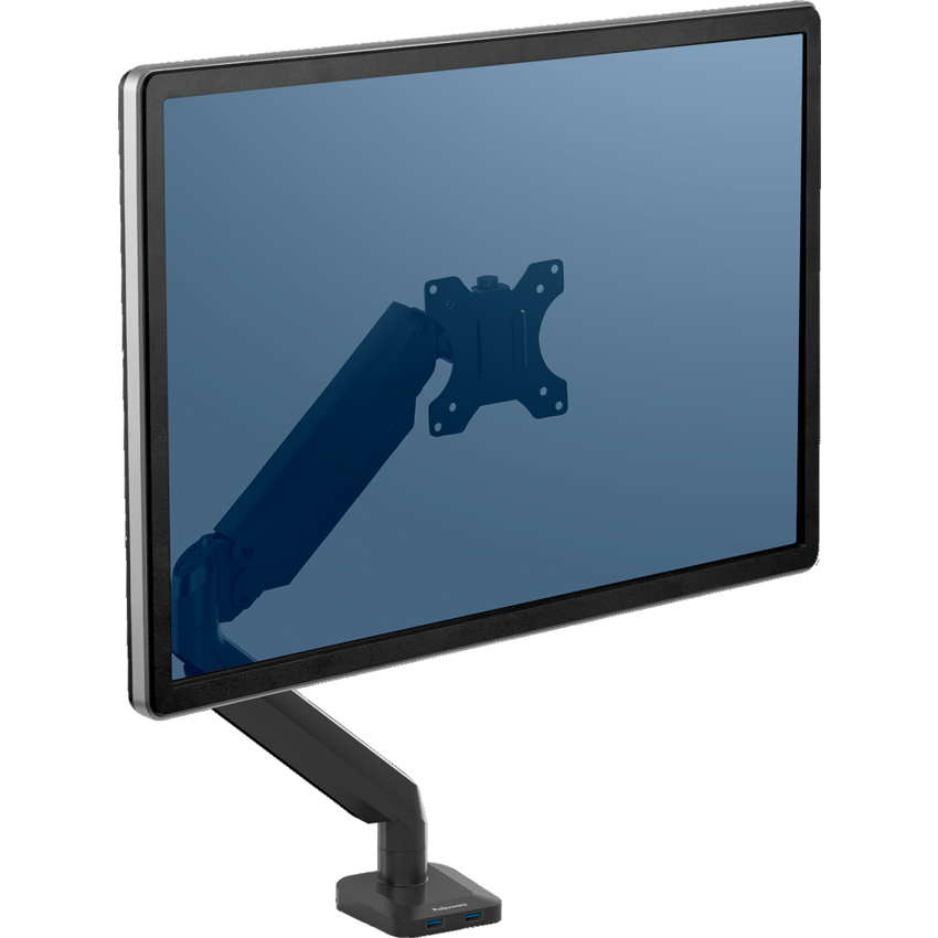 Increase valuable desk space and easily adjust your monitor to reduce eye, neck and shoulder strain. Mounts via clamp or grommet. Single Arm. Features cord management system, audio and mic ports. Meets VESA mounting standards. Height range from 6" to 17". Tilts -45° to +45°. 2-1/2" to 19-1/2" depth adjustment. Rotates 360°. For monitors up to 17.6 lbs (32") on each arm. Black.