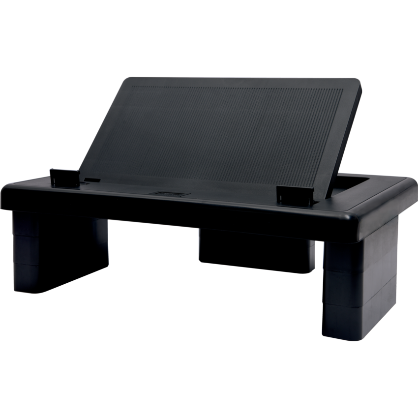 Multifunction monitor riser, laptop and printer stand with storage space underneath. Contains a minimum of 30% recycled content. Height and angle adjustable. Monitor riser offers 4 adjustable heights from 1" to 4-3/4", laptop stand offers 5 extra angle adjustable heights from 3-1/2" to 5-3/4". Includes cable clip. 66 lb capacity. 15-1/2"W x 10-3/4"D x 4-3/4"H. Black.