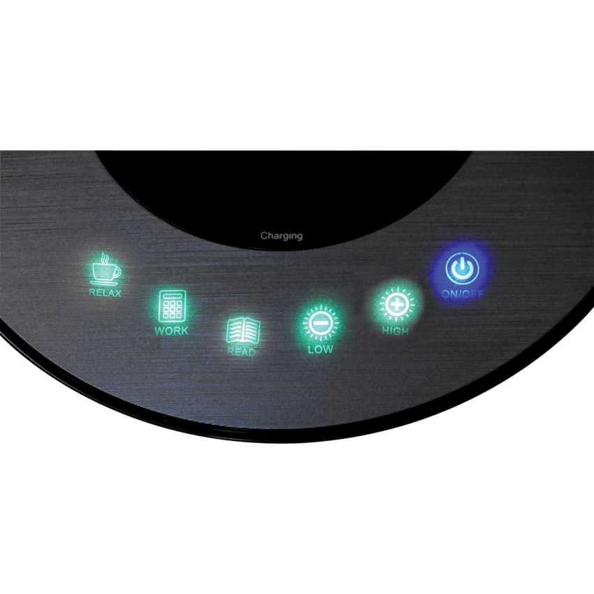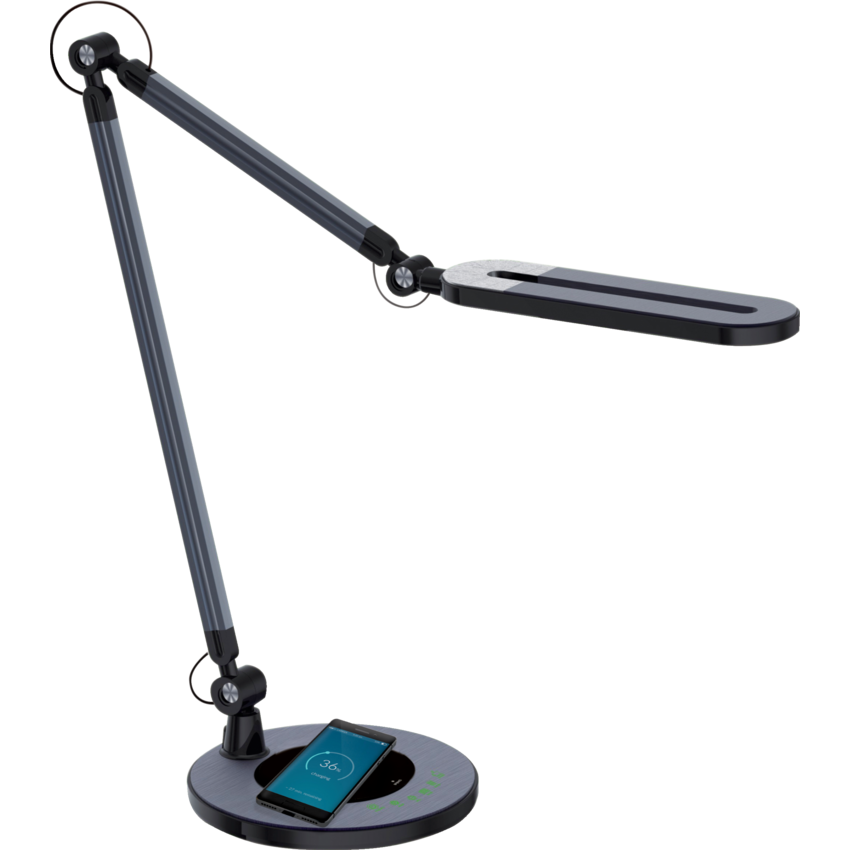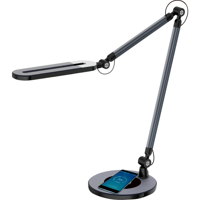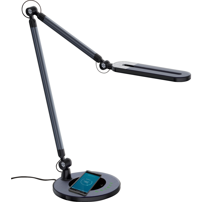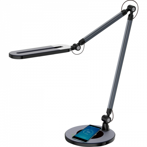 Modern design provides long reach with 3-way multi-angle rotation. Wireless charging of Qi-enabled devices making it the ideal task lamp for home or office. Adjustable light colour temperature: 3000/4000/6000°K (Relax/Work/Read). Touch sensor controls and stepless dimming. Intelligent memory restores last settings when lamp is turned on. 10W. 550 lumens. 32" high (Fully extended). Black.