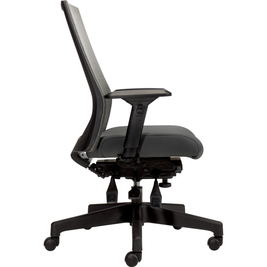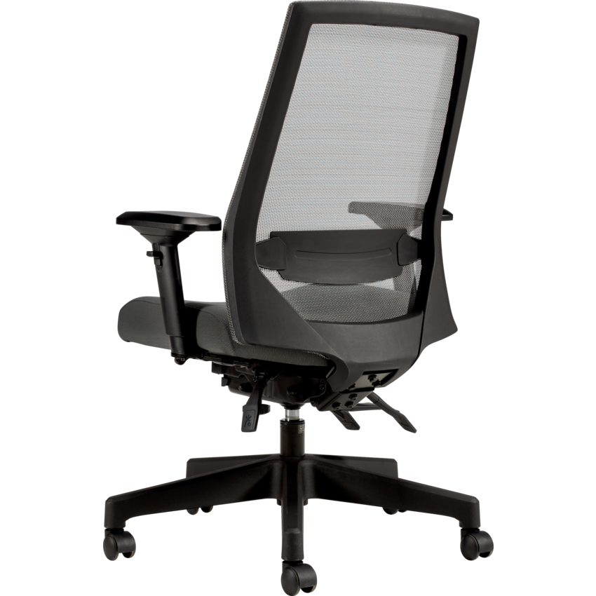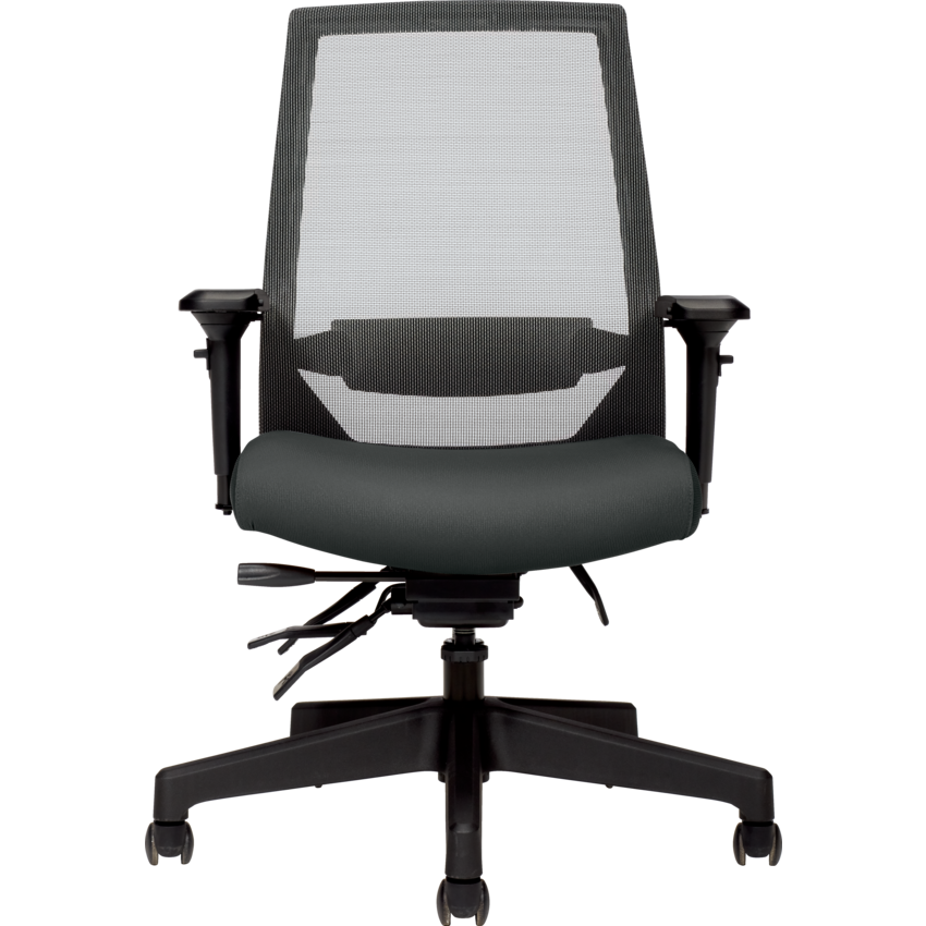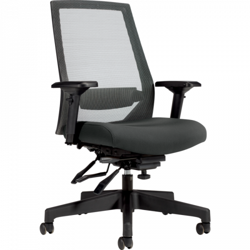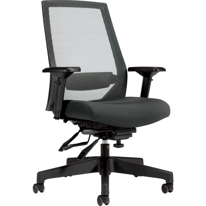 Made from heavy duty components. High Back. Pneumatic seat height adjustment. Seat range from 19" to 23". Seat depth adjustment. Infinite position back and seat angle adjustment, including forward tilt. Infinitely adjustable seat angle. Waterfall seat edge. Adjustable back angle. Infinite position tilt lock. Adjustable lumbar support. Tilt tension. Height and width adjustable arms with sliding, rotating and lockable armcaps. Weight capacity of 350 lbs. Dual wheel carpet casters. 54 lbs. 26-1/2"W x 23-1/2"D x 43-1/2"H. Assembly not included. Mesh back and Fabric seat. Waterfall Fabric. Grand.