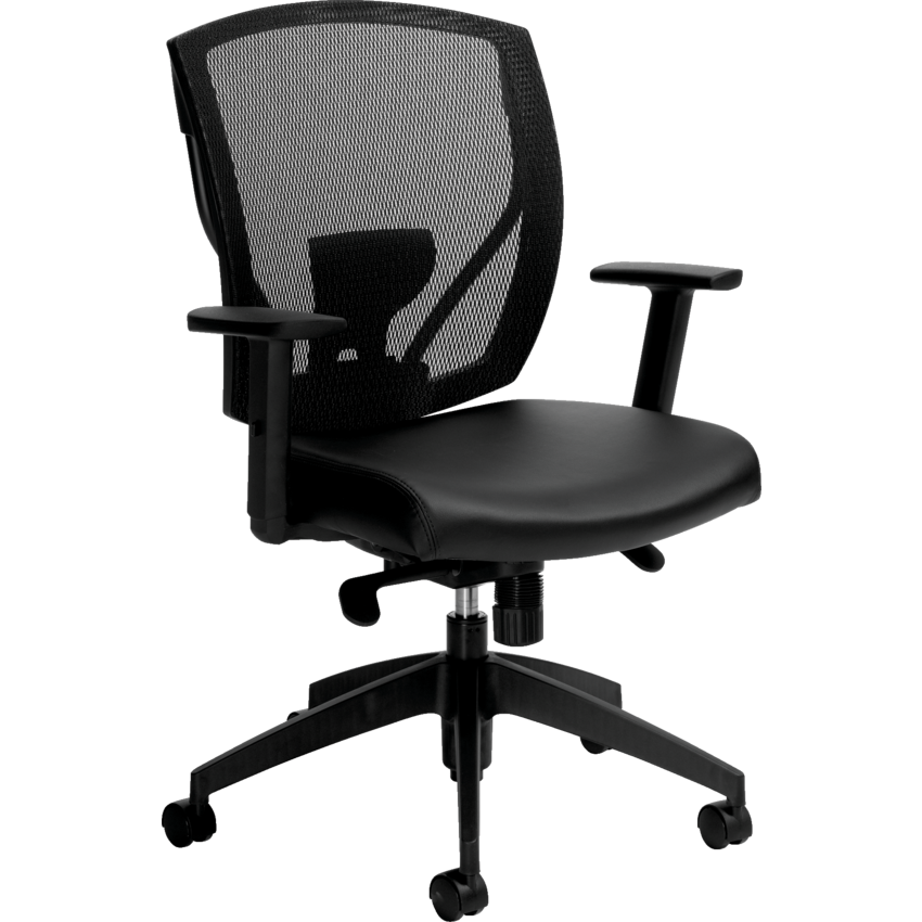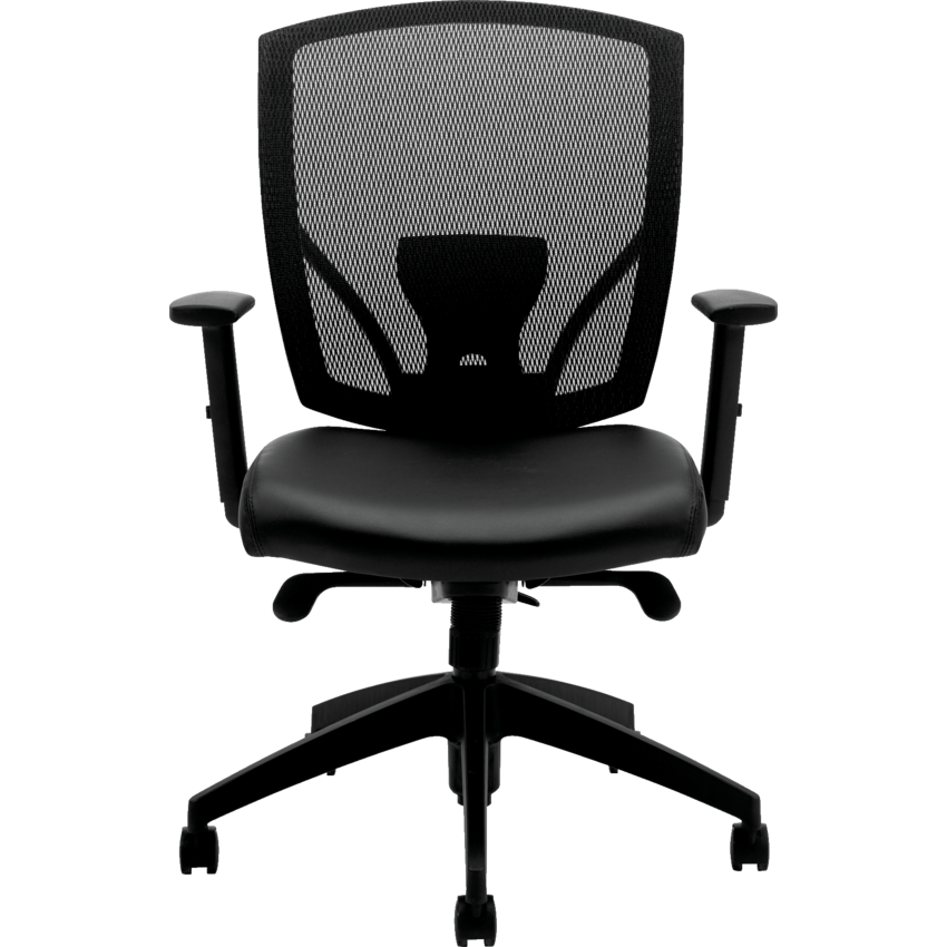 Medium Back. Pneumatic seat height adjustment. Seat range from 16-1/2" to 20-1/2". Back tilts 2 degrees for every 1 degree the seat tilts. Waterfall seat edge. Multi position tilt lock & tilt tension adjustment. Lumbar support with height adjustment. TIlt tension adjustment. Height adjustable arms with durable self-skinned urethane armcaps. Dual wheel carpet casters. 51 lbs. 26"W x 26-1/2"D x 39-1/2"H. Assembly not included. Mesh back and Leather seat. Luxhide. Black.