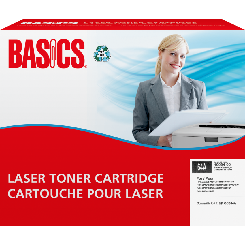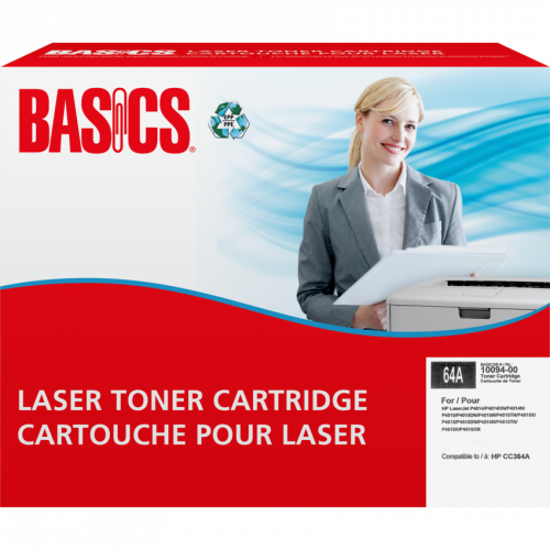 Basics® Brand cartridges are manufactured at North American ISO 9001:2000 registered facilities using returned, original equipment cartridges. These cartridges are designed, engineered and manufactured to meet OEM performance while ensuring top quality and consistent output. OEM# 64A. Basics®. HP LaserJet P4014, P4014DN, P4014N, P4015, P4015DN, P4015N, P4015TN, P4015X, P4515, P4515DN, P4515N, P4515TN, P4515X, P4515XM. Contains a minimum of 87% post-consumer recycled material. Yields 10,000 pages. Black.