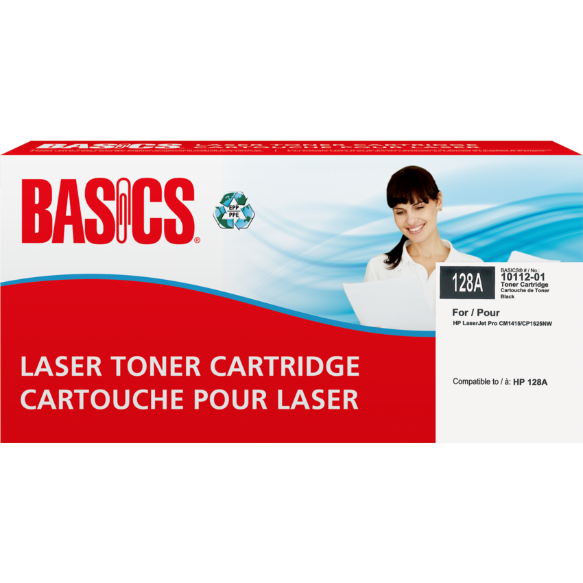 Basics® Brand cartridges are manufactured at North American ISO 9001:2000 registered facilities using returned, original equipment cartridges. These cartridges are designed, engineered and manufactured to meet OEM performance while ensuring top quality and consistent output. OEM# 128A. Basics®. HP LaserJet CM1415fnw, CP1525nw. Contains a minimum of 91% post-consumer recycled material. Yields 2,000 pages. Black.