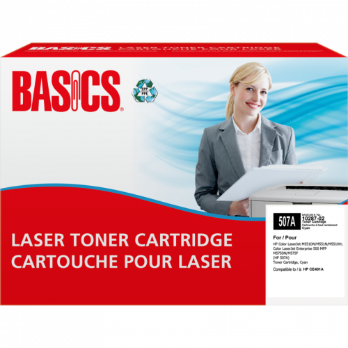 Basics® Brand cartridges are manufactured at North American ISO 9001:2000 registered facilities using returned, original equipment cartridges. These cartridges are designed, engineered and manufactured to meet OEM performance while ensuring top quality and consistent output. OEM# 507A. Basics®. HP Color LaserJet M551N, M551DN, M551XH; Color LaserJet Enterprise 500 MFP M570DN, M575DN, M575F. Contains a minimum of 59% post-consumer recycled content. Yields 6,000 pages. Cyan.