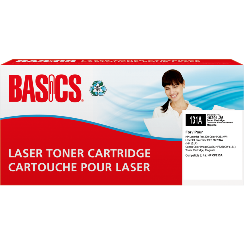 Basics® Brand cartridges are manufactured at North American ISO 9001:2000 registered facilities using returned, original equipment cartridges. These cartridges are designed, engineered and manufactured to meet OEM performance while ensuring top quality and consistent output. OEM# 131A. Basics®. HP LaserJet Pro 200 Color M251NW; LaserJet Pro Color MFP M276NW. Contains a minimum of 87% post-consumer recycled content. Yields 1,800 pages. Magenta.