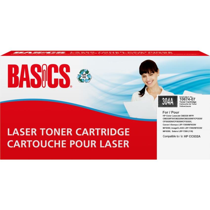 Basics® Brand cartridges are manufactured at North American ISO 9001:2000 registered facilities using returned, original equipment cartridges. These cartridges are designed, engineered and manufactured to meet OEM performance while ensuring top quality and consistent output. OEM# 304A. Basics®. HP Color LaserJet CM2320 MFP, CM2320FXI, CM2320N, CM2320NF, CP2025, CP2025DN, CP2025N, CP2025X. Cross Compatible with Canon I-Sensys LBP-7200C, LBP-7200CN, MF8330CDN, MF8350CDN; imageCLASS LBP-7200CDN, MF8330CDN, MF8350CDN, MF8380CDW, MF8380CW; Color imag. Contains a minimum of 46% post-consumer recycled material. Yields 2,800 pages. Yellow.