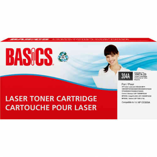 Basics® Brand cartridges are manufactured at North American ISO 9001:2000 registered facilities using returned, original equipment cartridges. These cartridges are designed, engineered and manufactured to meet OEM performance while ensuring top quality and consistent output. OEM# 304A. Basics®. HP Color LaserJet CM2320 MFP, CM2320FXI, CM2320N, CM2320NF, CP2025, CP2025DN, CP2025N, CP2025X. Cross Compatible with Canon I-Sensys LBP-7200C, LBP-7200CN, MF8330CDN, MF8350CDN; imageCLASS LBP-7200CDN, MF8330CDN, MF8350CDN, MF8380CDW, MF8380CW; Color imag. Contains a minimum of 46% post-consumer recycled material. Yields 2,800 pages. Magenta.