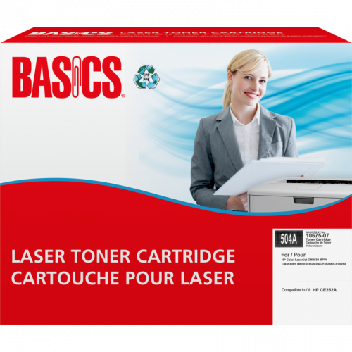 Basics® Brand cartridges are manufactured at North American ISO 9001:2000 registered facilities using returned, original equipment cartridges. These cartridges are designed, engineered and manufactured to meet OEM performance while ensuring top quality and consistent output. OEM# 504A. Basics®. HP Color LaserJet CM3530 MFP, CM3530FS MFP, CP3525DN, CP3525N, CP3525X. Contains a minimum of 61% post-consumer recycled material. Yields 7,000 pages. Yellow.