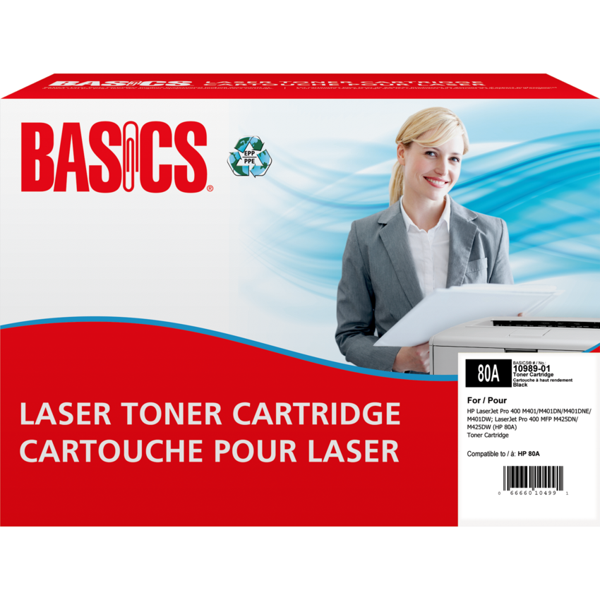 Basics® Brand cartridges are manufactured at North American ISO 9001:2000 registered facilities using returned, original equipment cartridges. These cartridges are designed, engineered and manufactured to meet OEM performance while ensuring top quality and consistent output. OEM# 80A. Basics®. HP LaserJet Pro 400 M401, M401DN, M401DNE, M401DW; LaserJet Pro 400 MFP M425DN, M425DW. Contains a minimum of 90% post-consumer recycled material. Yields 2,700 pages. Black.