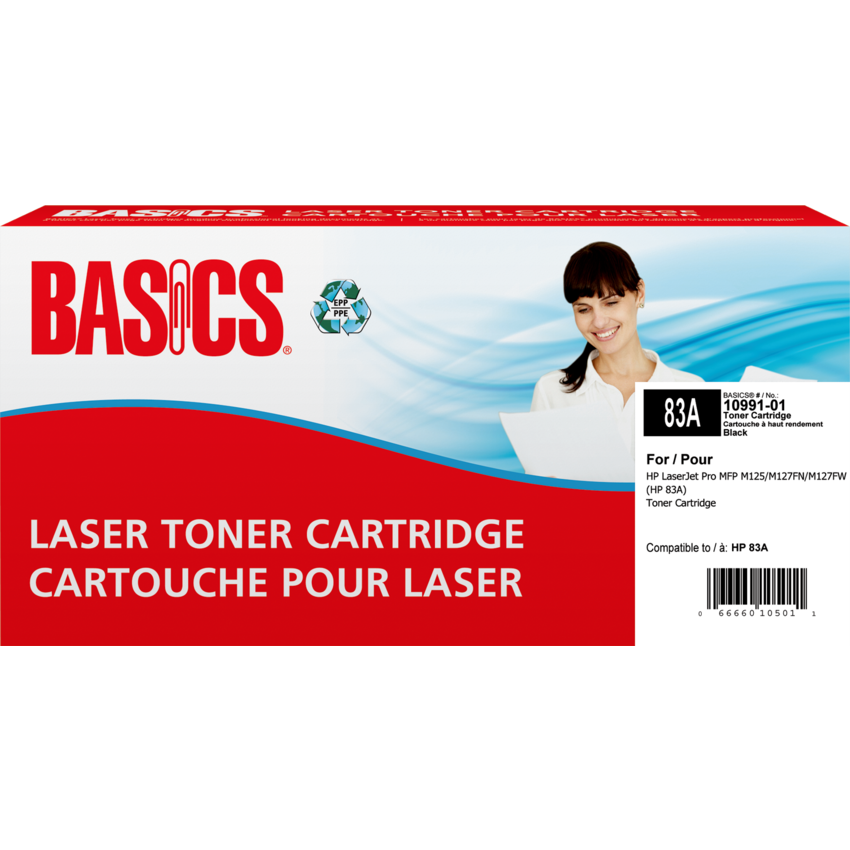 Basics® Brand cartridges are manufactured at North American ISO 9001:2000 registered facilities using returned, original equipment cartridges. These cartridges are designed, engineered and manufactured to meet OEM performance while ensuring top quality and consistent output. OEM# 83A. Basics®. HP LaserJet Pro MFP M125, M125A, M125NW, M127FN, M127FW, M201DW, M201N, M225DN, M225DW. Contains a minimum of 90% post-consumer recycled material. Yields 1,500 pages. Black.