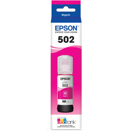 Fill up your select EcoTank printer with this 70mL T502 Magenta EcoTank Ink Bottle from Epson, which is rated to produce about 6000 prints. This bottle also features an auto-stop feature, which means that each color is uniquely keyed to prevent accidental filling of the wrong tank